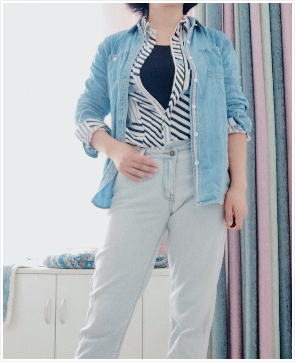 看下真人示范,我用的是牛仔衬衫搭配条纹衫,然后内搭了件小背心,整体有一种八九十年代的街头感。这两件衣服都是4年前的,平时也不怎么穿的。学会这个方法之后,又可以继续当新衣服穿了!